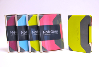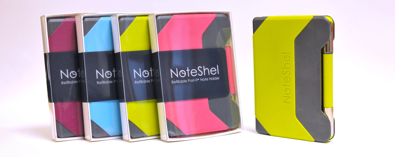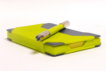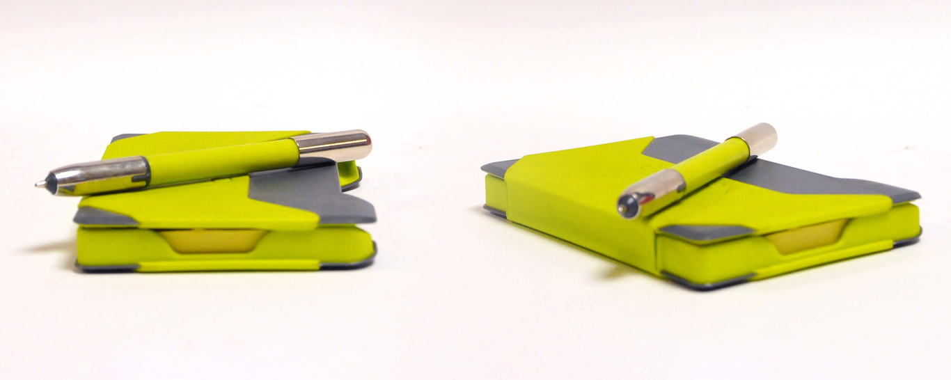 NoteShel was designed, developed and manufactured to fill the gap in the market for a durable, compact and refillable notepad and pen. It holds up to 90 sheets of 3" x 5" sticky notes and comes with a bespoke designed premium ballpoint pen. The pen is secured to the NoteShel by small, discrete magnets, and when the pen is removed to be used, its folding case can be held comfortably in the hand.